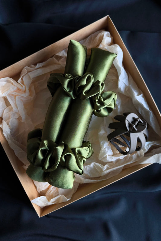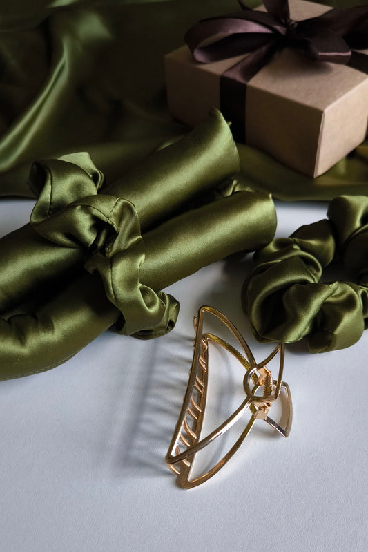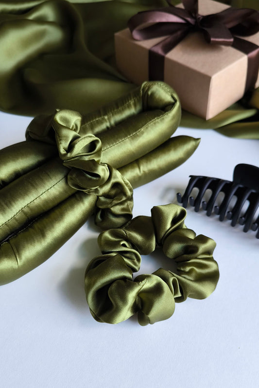 Silk Hair Heatless Curler, Pesto Green with golden hair clip