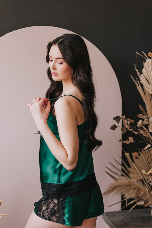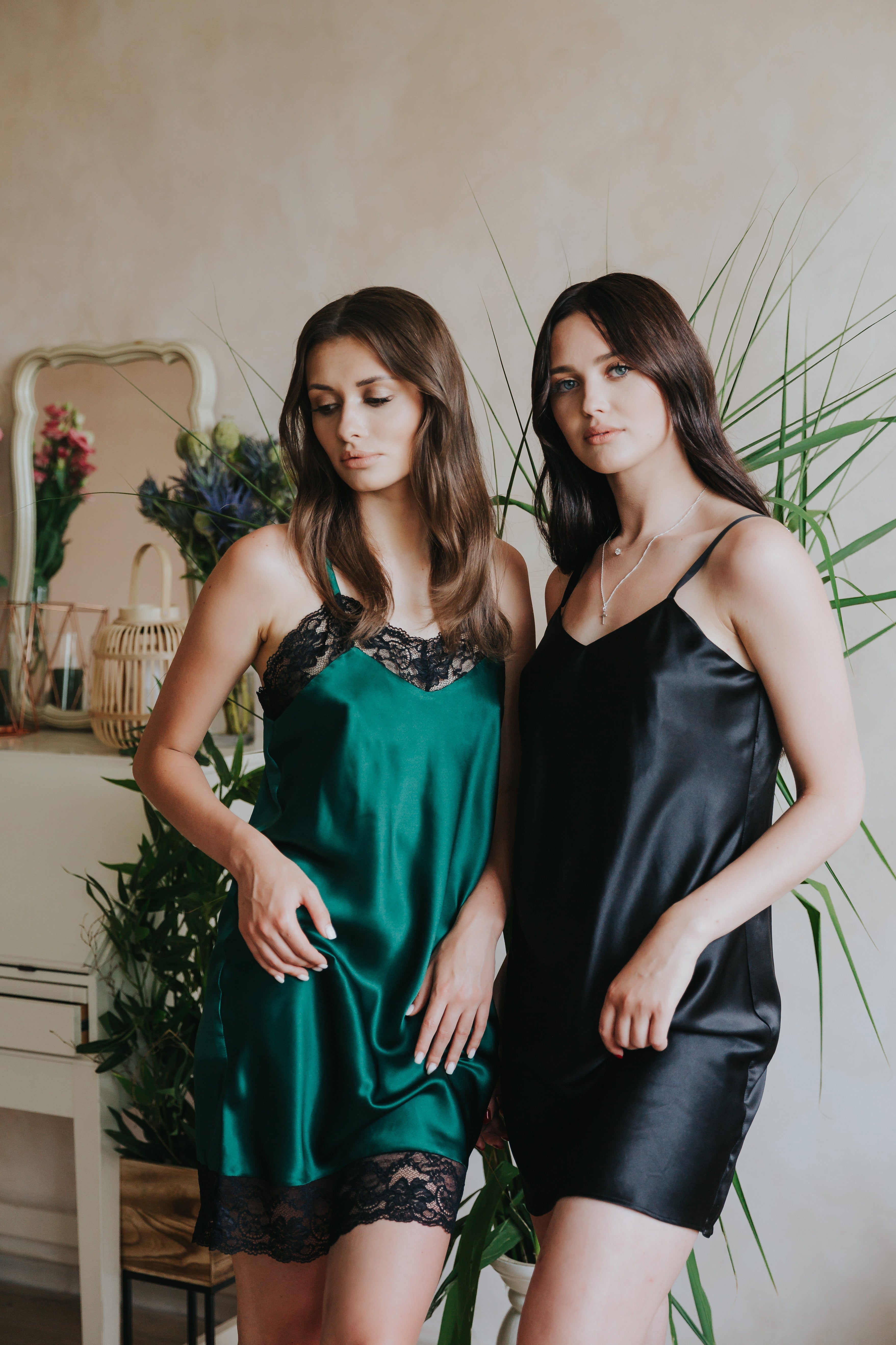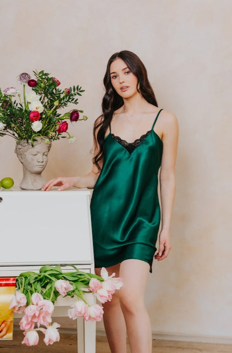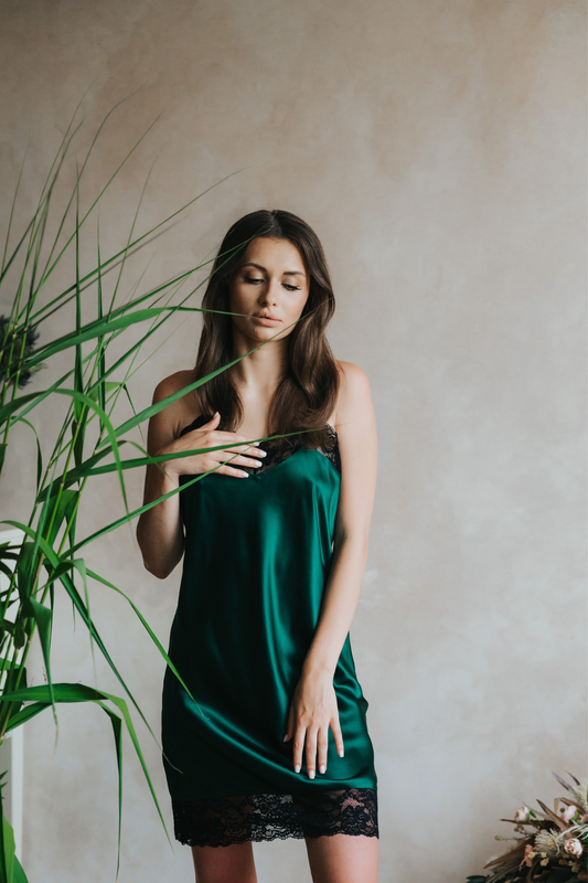 GREEN DRESS WITH LACEVery attractive design, especially the back. Owning one also comes with a feeling of exquisite comfort that only silk can provide.