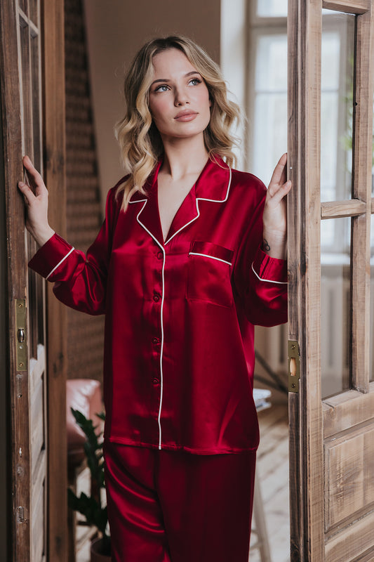 BURGUNDY SILK PAJAMAVery high quality sleepwear, comfortable! Thoughtful packaging, I recommend!