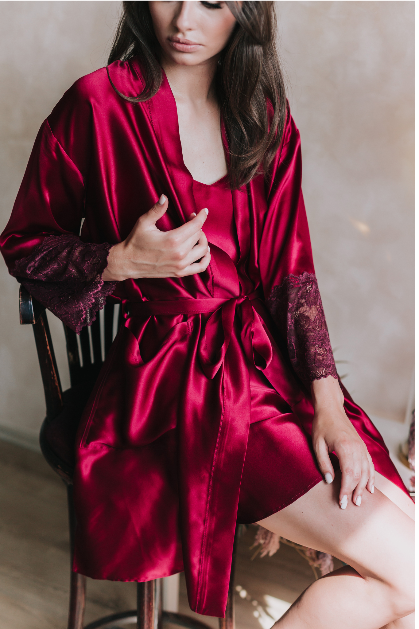 Vīna sarkans zīda halāts ar mežģīnēm (22 mm)