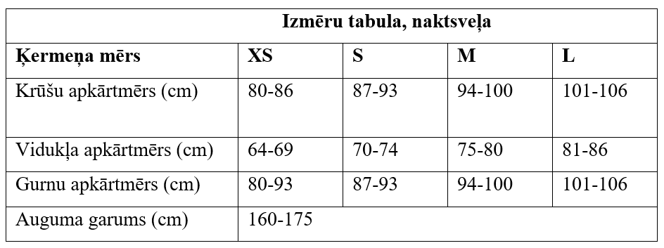 | Krūšu apkārtmērs (cm) | 82-86 | 87-93 | 94-100 | 101-106 |