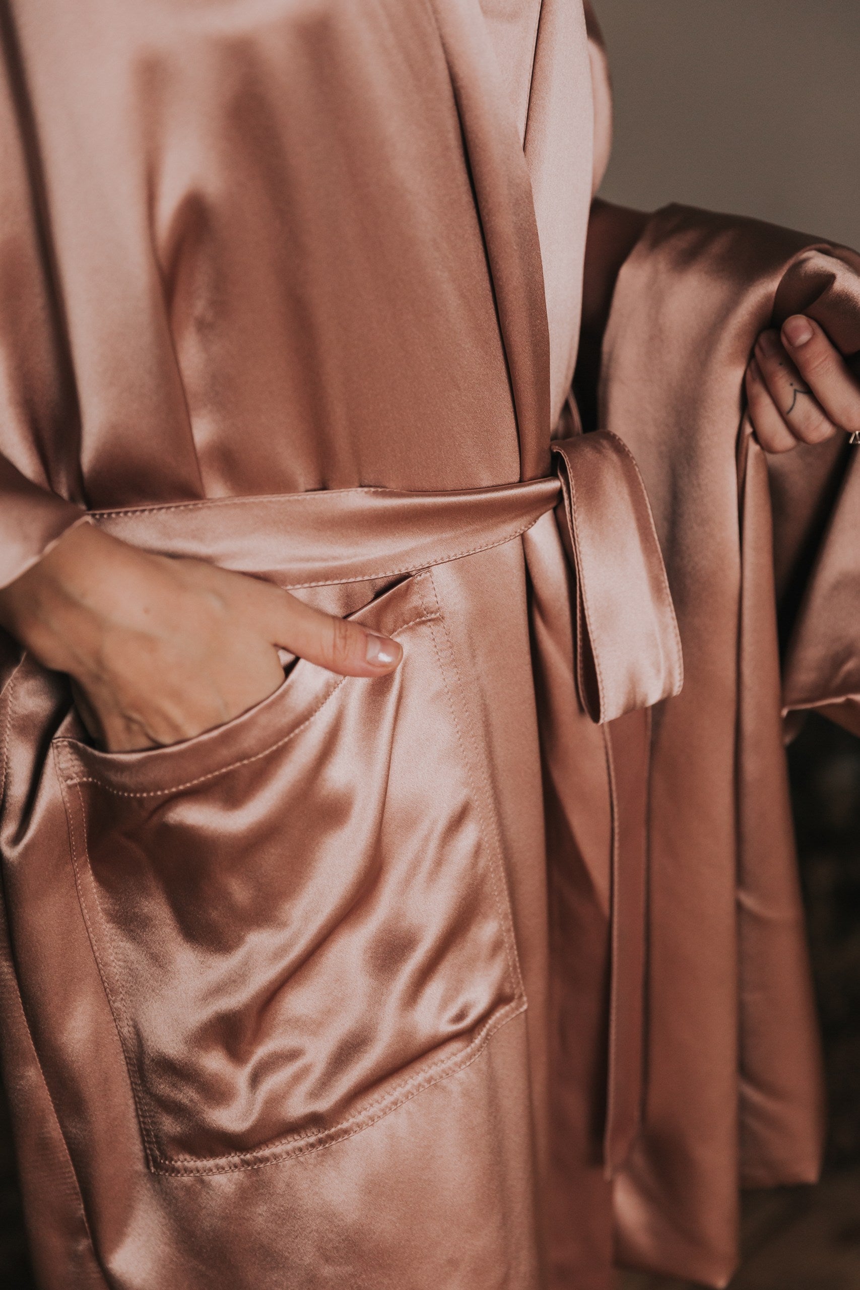 Unique design, comfortable and feminine kimono-style long robe with pockets and slit on sides. The luxurious satin of natural silk in Rose Gold color gives everyday both special luxury and grace.