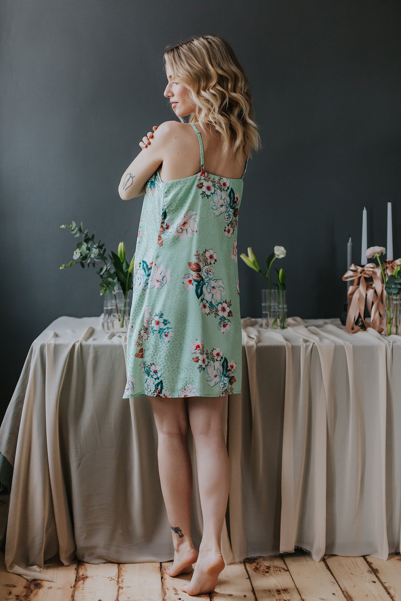 Silk nightgown with Floral Pattern, Mint Green