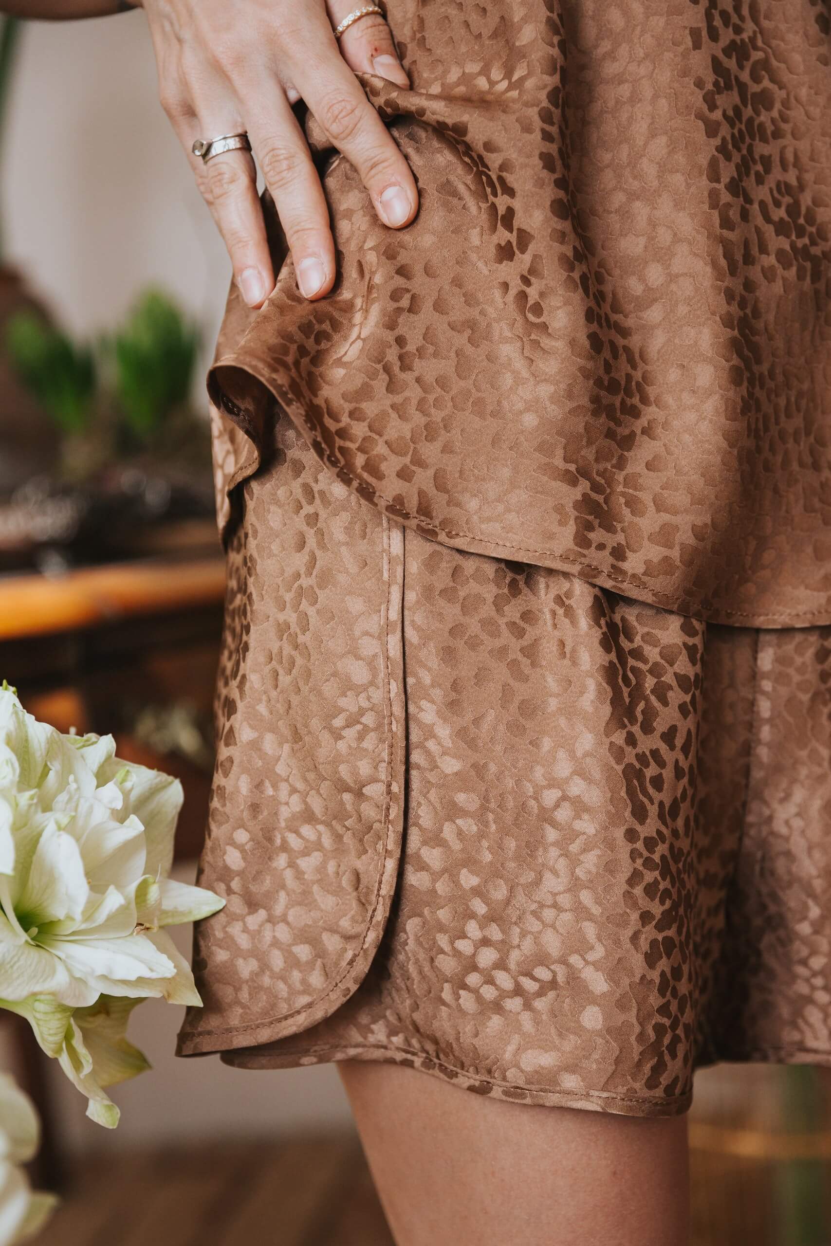 Caramel silk pajamas gently shimmers in the moonlight with which you can spend a peaceful evening and enjoy a leisurely morning coffee.
