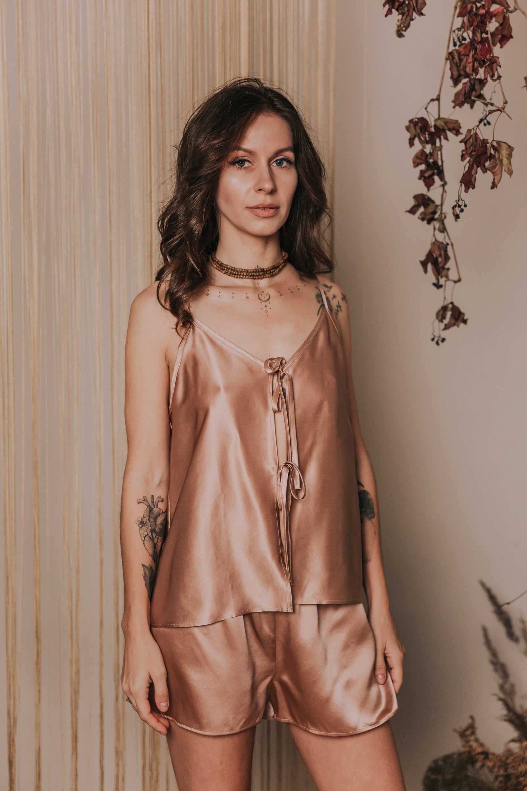 Silk Top with Ties at front and Shorts, "Aurora" Rose Gold