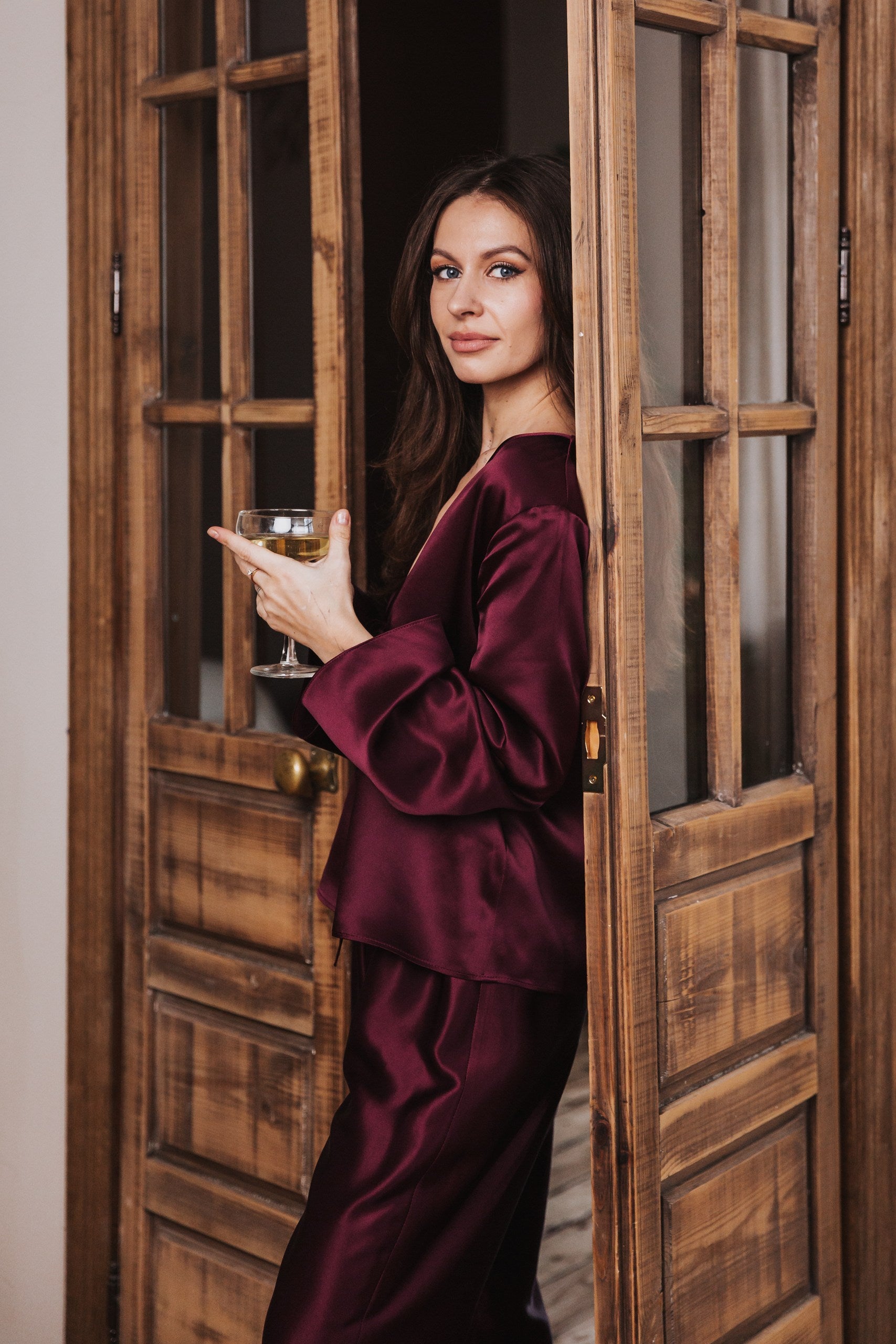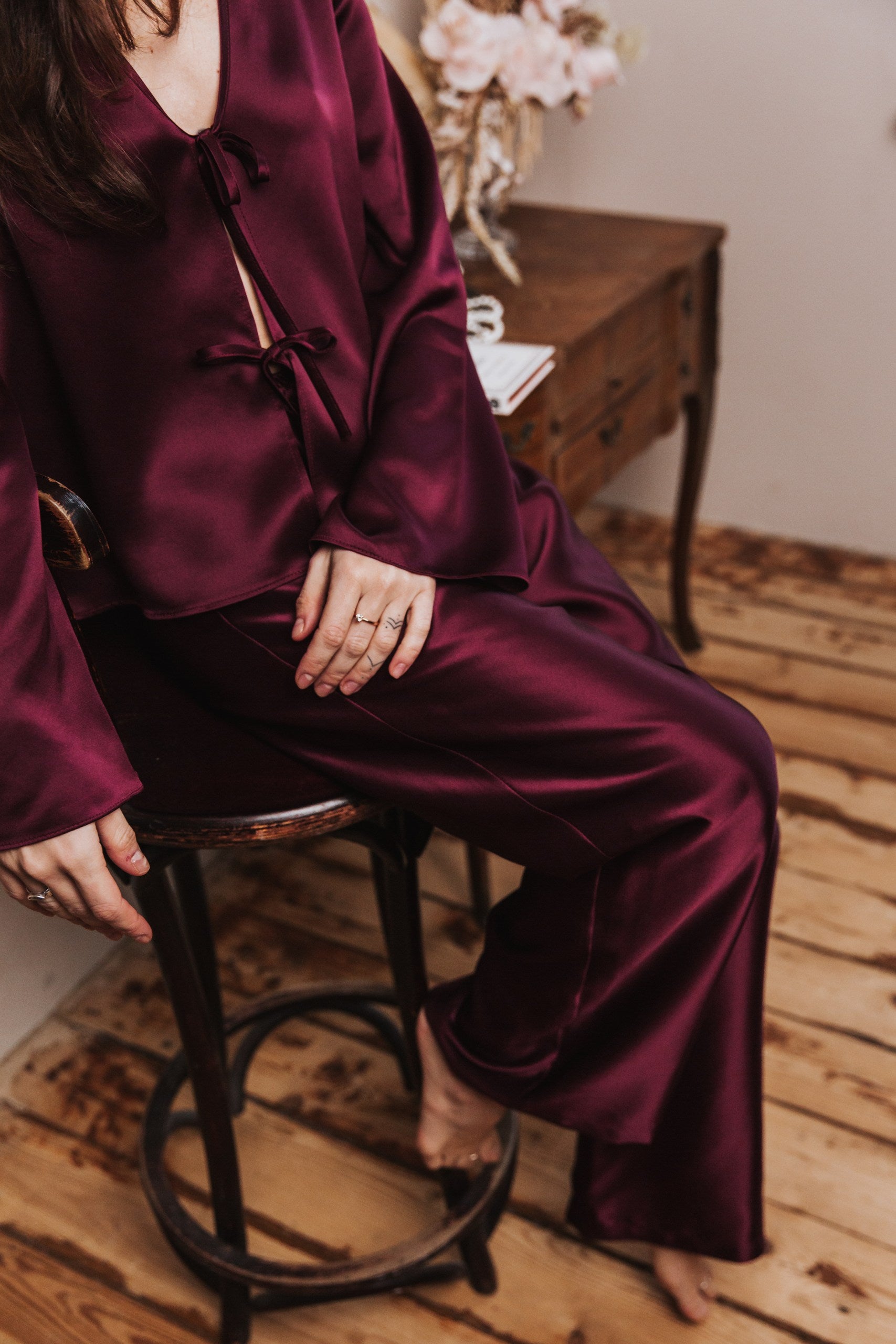 Silk Top with Ties at front and trousers, "Emma" Bordeaux